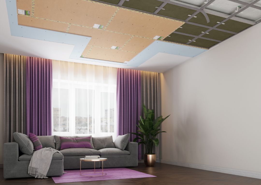 Толщина каркасной звукоизоляции потолка от 5см до 8 см. Применяем виброизоляционные подвесы и подложки, звукоизоляционные панели с кварцевым песком, профессиональные демпферные ленты, звукоизоляционные базальтовые плиты.