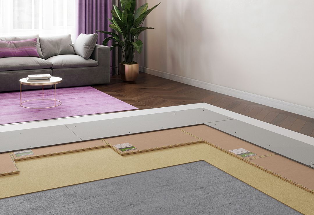 Толщина систем от 6 см до 9 см. Применяем виброизоляционные подложки, демпферные ленты, звукоизоляционные панели с кварцевым песком, базальтовые плиты специальной плотности.