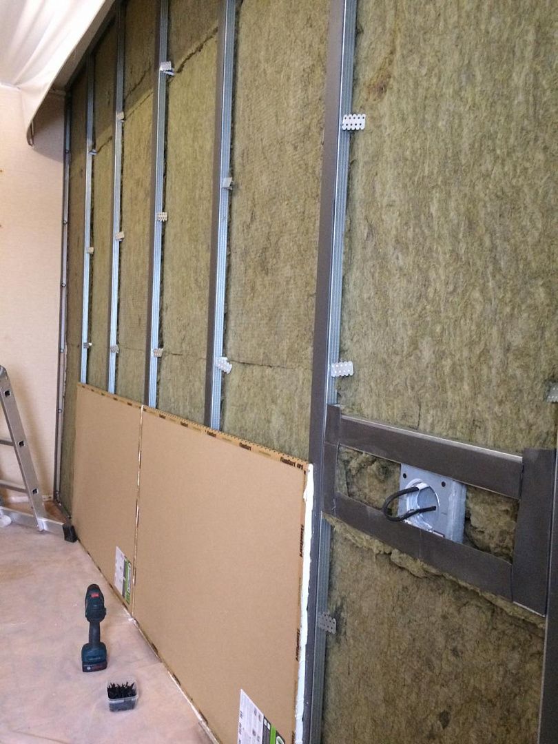 Толщина каркасных звукоизоляционных перегородок от 5 см до 8 см. Применяем звукоизоляционные панели с кварцевым песком, звукоизоляционные базальтовые плиты, подрозетники.